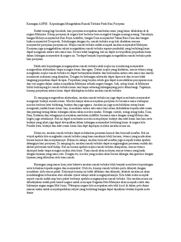 . KARANGAN CEMERLANG SPM - Kebaikan Amalan Rumah Terbuka Kebaikan Amalan Rumah Terbuka Amalan rumah terbuka sudah menjadi lumrah untuk sambutan perayaan di negara ini termasuk Hari Raya Aidilfitri Deepavali Tahun Baru Cina dan Hari Krismas. Ibu bapa pihak sekolah boleh memainkan peranan misalnya dengan mengadakan lawatan ke rumah anak yatim ataupun ke rumah. Kertas 1 Bahasa Melayu Mulai tahun 2021 Kertas 1 mata pelajaran Bahasa Melayu dalam peperiksaan SPM 11031 akan menggunakan format baharu.